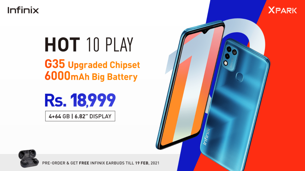 Pre-orders are starting from 15th February till 19th February only on XPark alongwith free gift of XE08 (Truly wireless Bluetooth earbuds). Hot 10 play will be available in offline market from February 20th onwards at PKR 18,999/-.